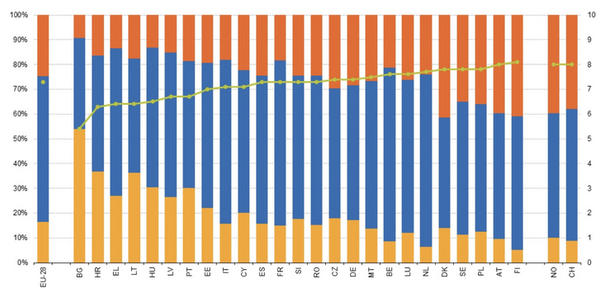 In 2018, the average satisfaction level in the Union was 7.3. Respondents gave scores of 0 to 10 points, with 0 for “not satisfied at all” and 10 for “fully satisfied”. The highest subjective well-being was measured in Austria, Finland, Norway and Switzerland, with values approaching or exceeding 8 points. The lowest score was produced in Bulgaria, where popular life satisfaction was estimated at 5.4. Lower-than-average scores were also recorded for Hungary, Croatia, Lithuania, Latvia and Portugal. The Hungarian score was far below the EU average, at 6.5.