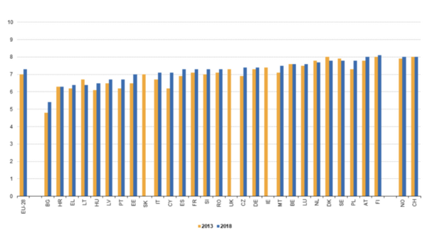 Most importantly, this single value is the highest in the EU, at 7.9 points. Solidly stable, it has only grown 0.1 points in 5 years. The highest values were recorded in Malta, Austria and Slovenia (8.6) and also in Switzerland, Sweden, Cyprus and Norway (8.5).