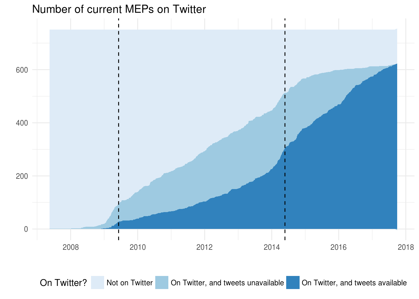It is important to highlight that Twitter limits the ability to retrieve older tweets. More specifically, it allows to retrieve systematically the latest 3,200 tweets for each user. This is substantial, but not enough to cover all of the Twitter history of the most prolific MEPs. More precisely, as of January 2017, 288 MEPs have tweeted more than 3,200 times. This means that at this stage it is possible to retrieve the full Twitter history of all MEPs effectively only for the last few weeks, and that the most frequent tweeters are left out of calculations for previous periods.