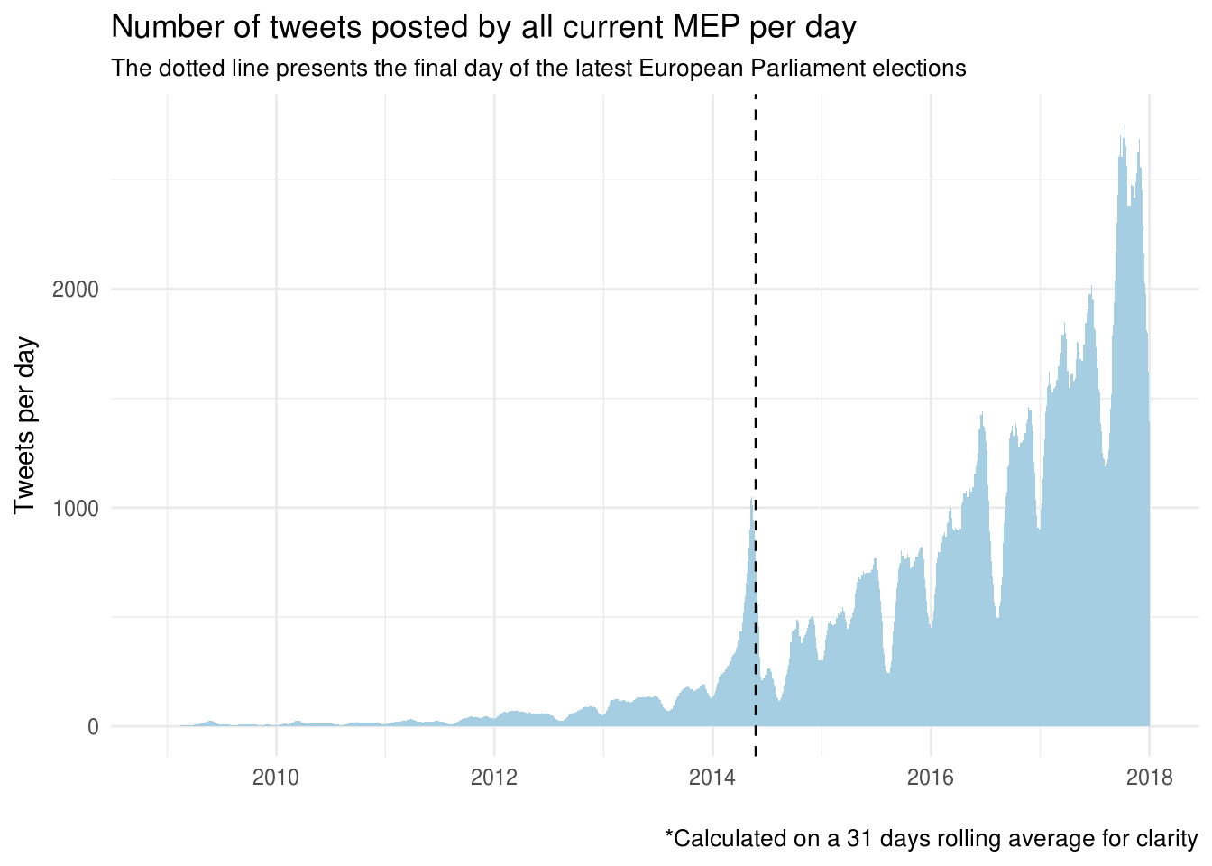 The graph shows a noticeable peak immediately preceding the European Parliament elections in May 2014, as well as seasonal variations highlighting periods of lower and higher activity.