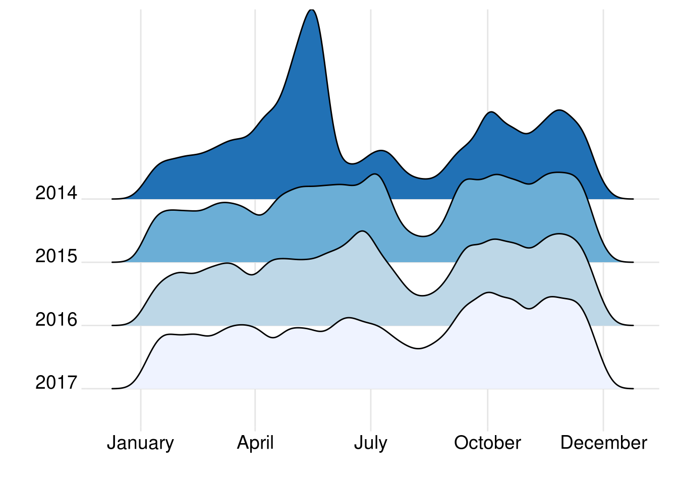 As it appears more clearly from the following ridgeline graph, which includes yearly-adjusted data starting only with 2014, the seasonal trends can easily be explained: MEPs collectively tweet less in the summer (and in August in particular), as they do in the weeks around the new year.