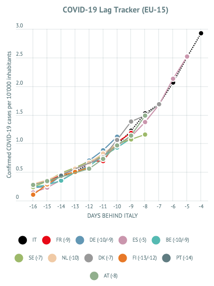Yes, we’re all on the same boat. Silvia Merler is tracking the spread of COVID-19 across different countries, and essentially everyone in Europe is on the same track of Italy – as governments have finally started to realise, introducing lockdown measures in most member states.