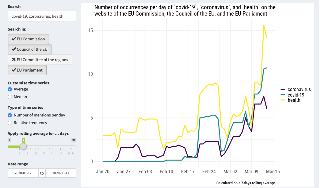 Our Quote Finder tool comes in handy if one wants to track the rise in attention by the EU institutions, and it makes it easy to find and filter what they’ve been saying about COVID-19: