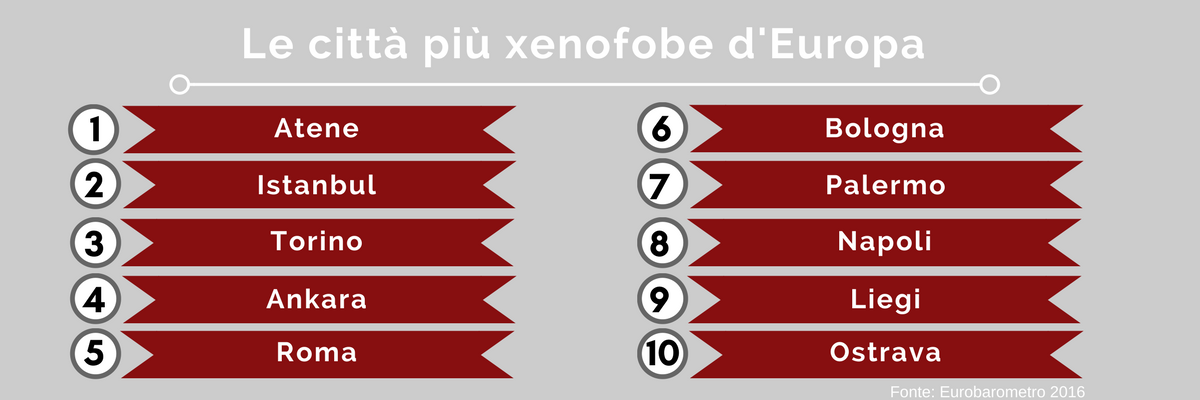 Stando all’Eurobarometro, nel complesso la xenofobia non è in aumento nelle città europee – ma esistono eccezioni e controtendenze notevoli, soprattutto nell’Europa meridionale